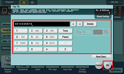 [Fax Number] | Enter the fax number for the destination using the Keypad. |