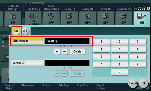 Tap [ON] and enter the Confidential User Box number on the destination machine in [SUB Address], using the Keypad.