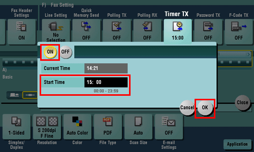 Tap [ON], enter the time to send a fax using the Keypad, then tap [OK].