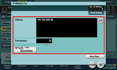 Enter either the IP address, host name or E-mail address of the destination in [Address], the port number used for fax transmission in [Port Number], then select [Color] or [Black&White] from [Machine Type].
