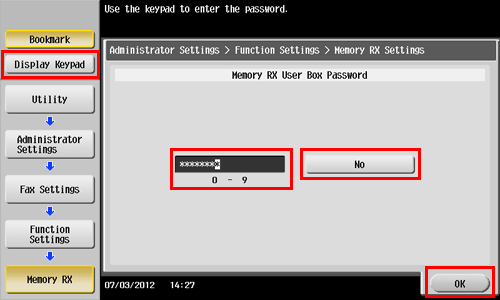 Tap [No], enter the password for processing faxes saved in a User Box using the Keypad, then tap [OK].