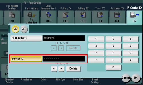 If a communications password is set for the Confidential User Box on the recipient machine, enter the communications password in [Sender ID] using the Keypad.