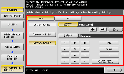 [Output Method] | To have forwarded faxes printed out on this machine, select [Forward & Print]. To have faxes printed out on this machine only in the case forwarding has failed, select [Forward & Print (If TX Fails)]. |