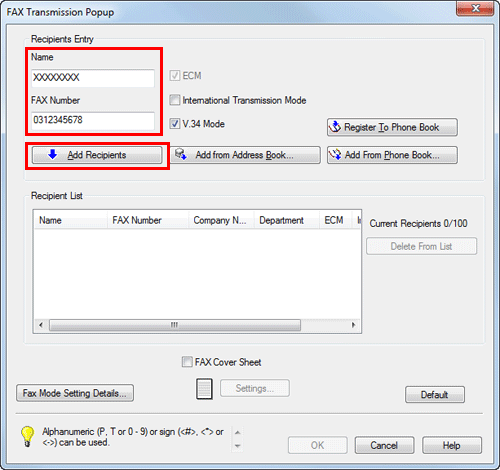 Enter the name and the fax number of the destination, then click [Add Recipients].
