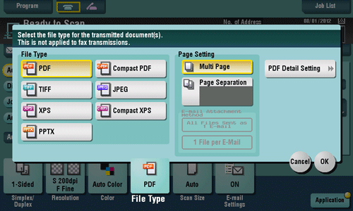 [PDF Detail Setting] | If [PDF] or [Compact PDF] is selected for file format, you can configure the PDF option settings. You can enhance security by attaching a digital signature that identifies the author of the file, by file encryption, etc. For details, refer to Here. |