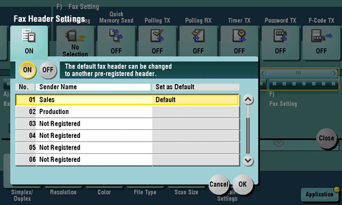 Changes on [Fax Header Settings] are only temporary. It is useful to specify frequently used sender names as defaults when registering sender names.