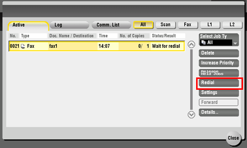 Select a job you wish to resend and tap [Redial].