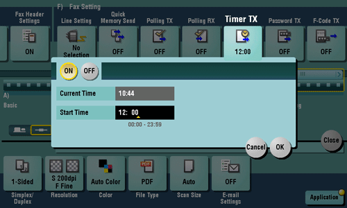 Tap [Application] - [Fax Setting] - [Timer TX], then tap [ON].