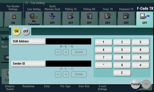 Tap [Application] - [Fax Setting] - [F-Code TX], then tap [ON].