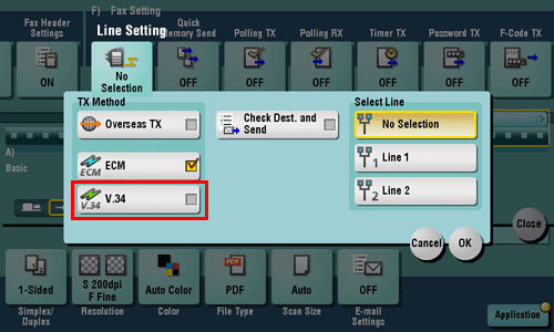 By default, this machine transmits faxes with V34. You can send faxes with V34 canceled if it is not possible to establish a communication in the Super G3 mode depending on telephone line conditions (for example, when the remote or this machine is connected to a PBX line).