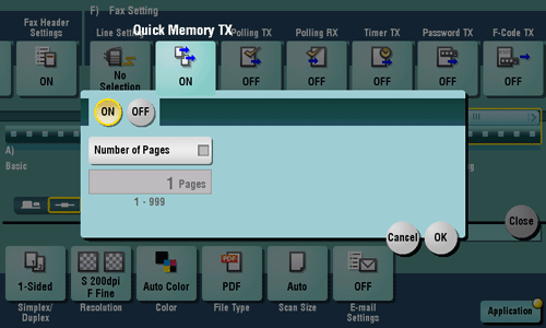 Quick Memory TX is a method to start sending a fax as soon as one page of the original has been scanned. The total number of pages transmitted can be entered in the sender record.