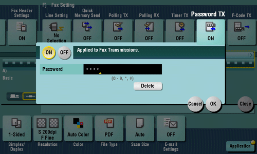 Tap [Application] - [Fax Setting] - [Password TX], then tap [ON].