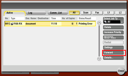 Select a job received using in-memory proxy reception, then tap [Forward].
