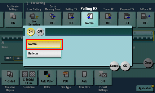 Tap [Application] - [Fax Setting] - [Polling RX], then tap [ON].