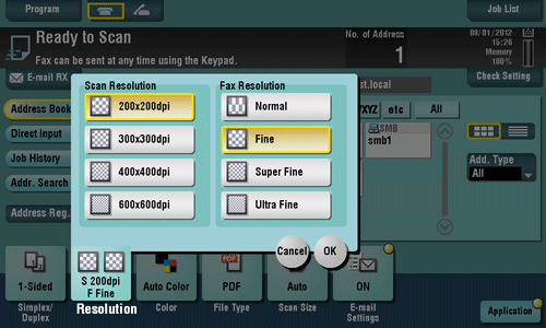 The finer the scan resolution is, the larger the data volume becomes, resulting in longer transmission time. To use an E-mail as a transmission method such as Scan to E-mail or Internet fax transmission, check that the data capacity are not limited.