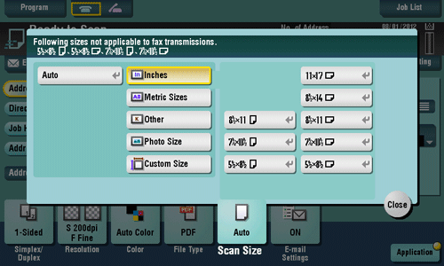[Inches] | Select this option to scan an inch-size original. Tap [Inches], and select a standard inch size. |