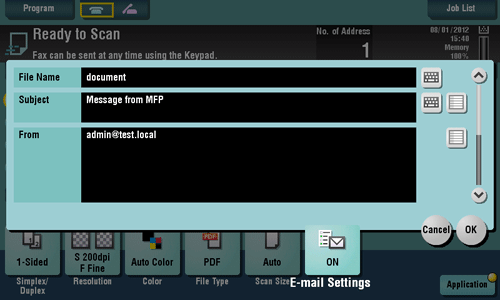 [From] | If necessary, change the sender E-mail address. In normal circumstances, the E-mail address of the administrator is used as sender E-mail address. If user authentication is installed on this machine, the E-mail address of the login user is used as sender E-mail address. |