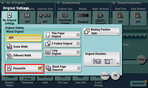 [Copied Paper] | Tap this button to scan originals containing uniform density and that are printed on copier or printer, at the optimum level of image quality. |
