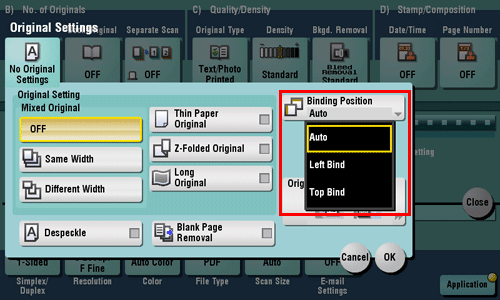 When scanning a 2-sided original, select the original binding position to prevent the binding positions being reversed between the front and rear faces.