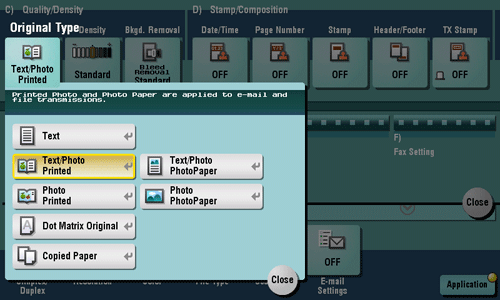 [Text/Photo Printed] | Tap this button to scan an original containing of text and photos at the optimum level of image quality. Sharpen the edges of text, and smoothen photos. Select this option to scan printed originals such as brochures and catalogs. |