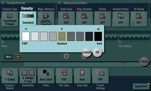 Adjust the density of the original with a colored background (newspaper, recycle paper, etc.) or the background of an original that is so thin that text or images on the back would also be scanned.