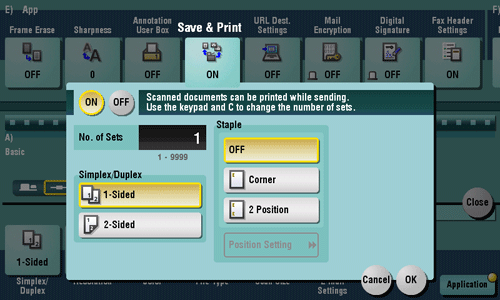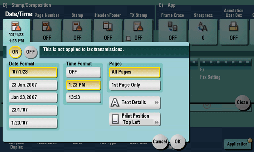 Select the stamping position and representation, and add the date and time the original is scanned. The date and time can be printed either on all pages or only on the first page.