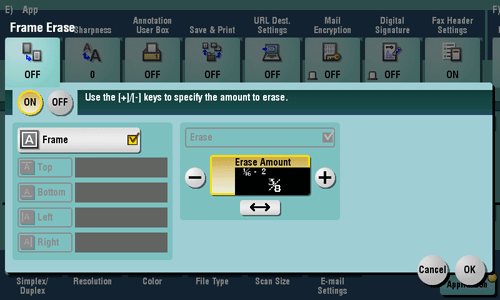 [Top][Bottom][Left][Right] | Select this option to erase the four sides of the original to different widths. Clear the [Frame] check box, select a side ([Top], [Bottom], [Left] or [Right]) and specify the width of the area in [Erase Amount] by tapping [+]/[-] for an inch area and by tapping [+]/[-] or Keypad for a centimeter area. To display the Keypad, tap the input area for the numeral. If you do not want to erase the side, cancel the setting for [Erase]. |