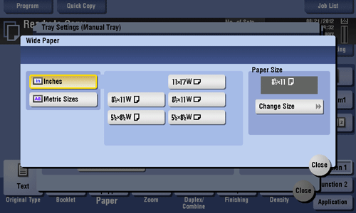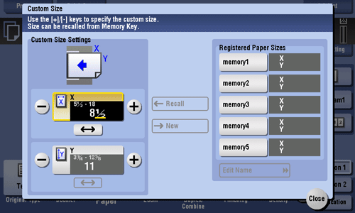 [Custom Size Settings] | For the inch area, tap [+]/[-] to enter the length (X) and width (Y) of the paper. After you have entered the size, select a key ([memory1] to [memory5]) in [Registered Paper Sizes], and tap [New]. Then the size you have entered is registered in the memory. You can recall the registered size in the future. |