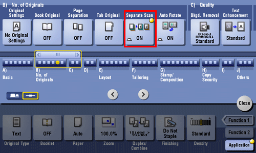 Originals are scanned with different settings for each set, and copied collectively. Use this function when various types of originals are mixed, such as 1-sided original to be printed on one side of paper, and 2-sided original to be copied by enlarging.