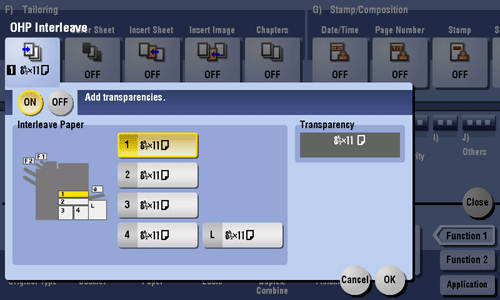 The paper size of the transparencies loaded on the Bypass Tray is displayed in [Transparency]. Be sure to use the same size for loaded transparencies and the paper to be inserted.