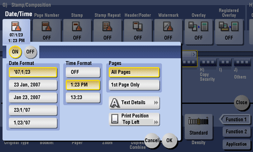 Select the stamping position and format, and add the date and time on copied sheets. The date and time can be printed either on all pages or only on the first page.