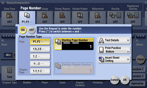 [Starting Page Number] | Enter the starting page number to be printed on the first page using Keypad. To display the Keypad, tap the input area for the numeral. For example, to print page numbers from the third page of the original, enter "-1". The first page of the original is counted as "-1", and the second page as "0", and the third page is counted as "1". In [Starting Page Number], a page number is printed on pages 1 and later. If "2" is entered, page numbers are printed from the first page of the original as "2, 3", etc. in order. The "-" (minus sign) changes to + each time you tap [*]. |