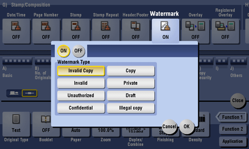 [Recall Overlay Image] | Specify which side of the paper to compose the overlay image, and select an overlay image to be composed. Check the density, composition method, and preview of overlay image if necessary. If you set [Apply on Back], the image on the front side is composed on the back side of paper. |
