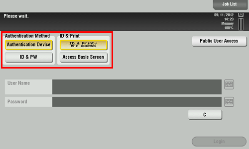 When you select [Access Basic Screen] in [ID & Print], you can log in without starting printing.
