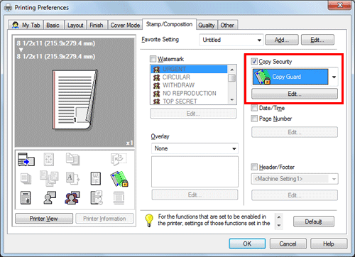 On the [Stamp/Composition] tab, select the [Copy Security] check box, and then select [Copy Guard].