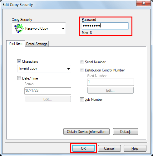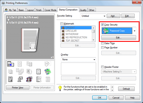On the [Stamp/Composition] tab, select the [Copy Security] check box, and then select [Password Copy].