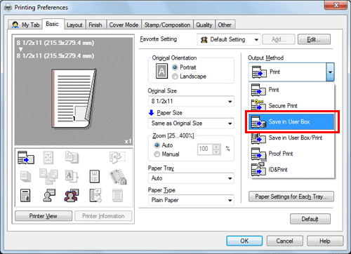 In [Output Method] in the [Basic] tab, select [Save in User Box].