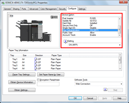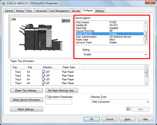 In [Device Option] in the [Configure] tab, check that the [User Authentication] and [Single Sign-On] settings are correctly configured for your operating environment.