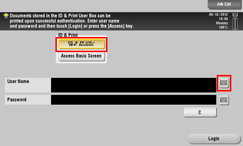 Check that [ID & Print/MFP Access] is selected in [ID & Print], and tap [Login].