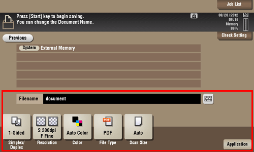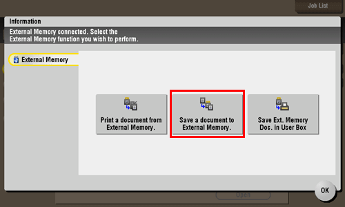 You can also save files by selecting the User Box operation mode and by tapping [System] - [External Memory] - [Save].