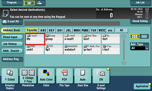 By selecting the [Me] key displayed in the [Address Book] screen, you can send E-mails to your E-mail address. If you log in to this machine that provides user authentication, the [Me] key appears in the [Address Book] screen. The [Me] key is assigned to an E-mail address of the login user. To use this function, you do not have to register your E-mail address in the address book.