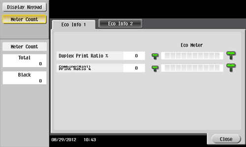 The Eco Info function automatically calculates the ratio of paper saving by two-sided printing or page combine function and a transition of power consumption based on the usage of this machine, all of which enables you to check the resulting eco information. You can review the operation method of this machine based on eco information to develop an awareness of costs and work to reduce costs.