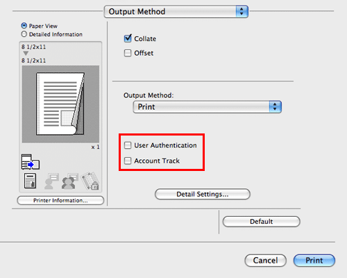 In the [Output Method] window, select the [User Authentication] check box (and the [Account Track] check box).