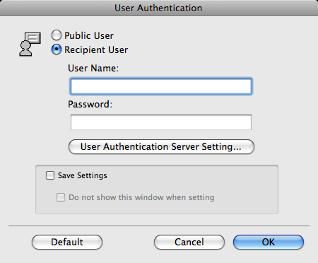 When user authentication is enabled, select [Recipient User], enter the user name and password, then click [OK].