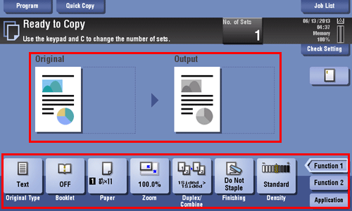 To configure various copy settings smoothly, you can collectively display the basic copy settings in a single screen, and arrange frequently-used keys in the main screen. For details, refer to Here.