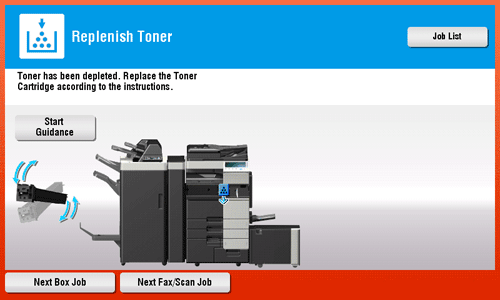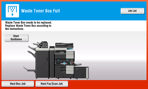 When toner is depleted or when it is time to replace a Waste Toner Box, the message shown below appears. When this message appears, replace a Toner Cartridge or Waste Toner Box based on the maintenance contract.