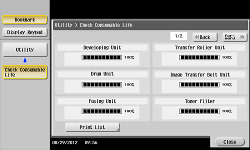 Check the status of consumables (consumption level) using the Touch Panel. When necessary, each level can be printed in list form.