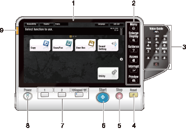 6 | Start | Press this key to start an operation such as copying, scanning, faxing, or printing.