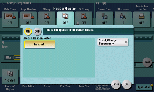 [Check/Change Temporarily] | If necessary, check or temporarily change the details of the program that is selected in [Recall Header/Footer].