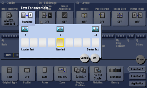 [Text] | Copy originals primarily containing text at the optimum image quality level. Sharpen the edges of text to improve legibility. |